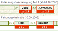 Die HSN und TSN finden Sie entweder in der neuen Zulassungsbescheinigung Teil 1 unter Position 2.1 und 2.2 in Zeile B oder in Ihrem Fahrzeugschein unter Position 2 und 3.